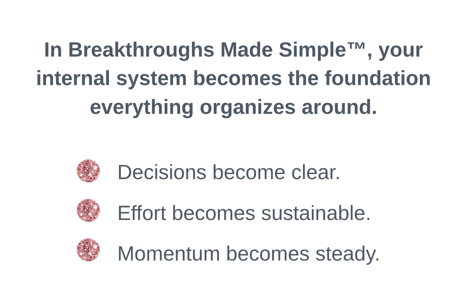 Breakthroughs Made Simple™ is intentionally designed to align with how change naturally unfolds. Every element—from the curriculum to the live calls, tools, and support—is structured to create clarity, steadiness, and sustainable transformation. This isn’t about rushing or forcing results; it’s about creating the conditions where breakthroughs happen and hold.